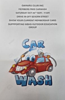 CAR WASH: We have a car wash available for financial members this Saturday 25th October for 9-11am, please present your card to have your car washed.  Oamaru Club supporting WBHS Outdoor Education Group